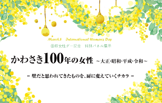 大正・昭和・平成・令和という時代の奔流の中、川崎で生きてきた女性たちの100年を写真パネルで振り返ります。道を切り拓いてくれた先輩女性たち、そして力いっぱい今を生きる女性たちの姿から、この100年の間に変わったこと、変わらなかったことを知り、この先の100年を歩んでいくための手がかりとしていただくための展示です。