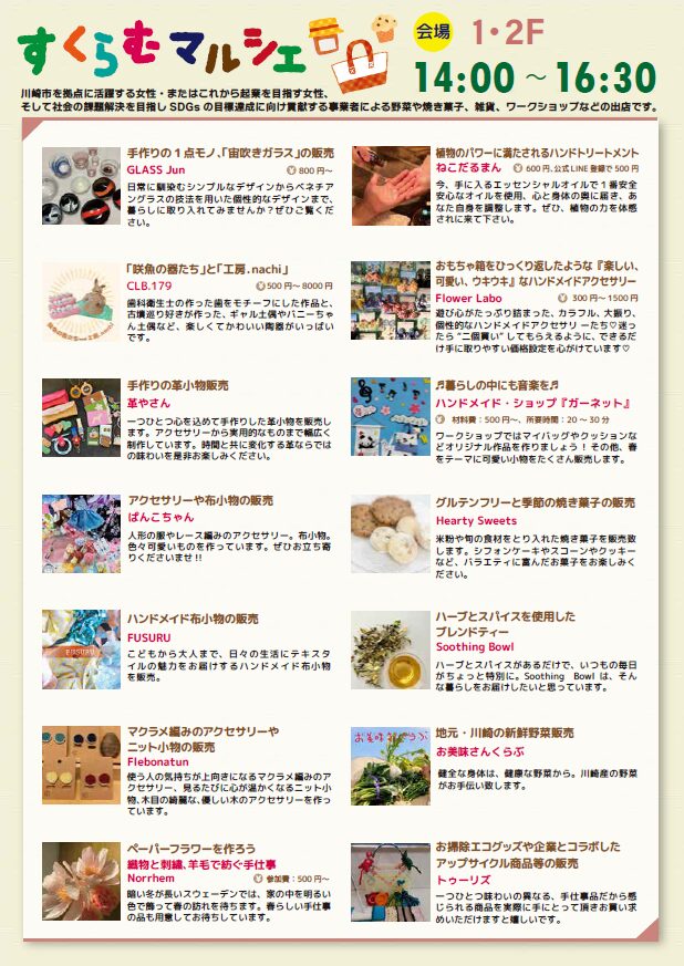 「すくらむマルシェ」は、川崎市を拠点に活躍する女性・またはこれから起業を目指す女性、そして社会の課題解決を目指しSDGsの目標達成に向け貢献する事業者による野菜や焼き菓子、雑貨、ワークショップなどの出店です。