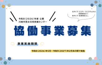 本事業の選考ならびに実施にかかる公正性、透明性を高めるため、採択団体名、事業概要、実施状況、調査報告等は、センターホームページ等により公表します。また、広報物や成果物(電子媒体も含む)については、必ず「2026年度川崎市男女共同参画センター協働事業」である旨を明記していただきます。購入備品についてもその旨、シールなどで表示していただきます。